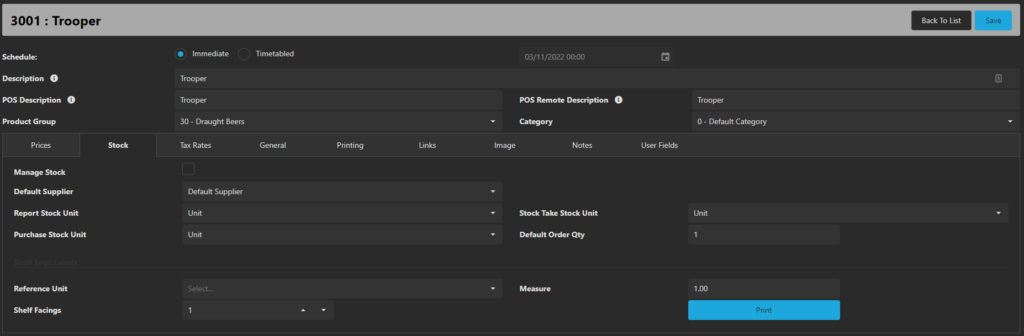 When a product is created, as default it will not be set to manage stock. You can enable this by going into the Stock tab against a product in Product Programming. In here, you can tick the box which says Manage Stock. This section also allows you to set what units will be used for this product, specifically: