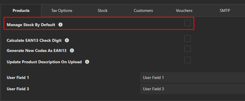 As mentioned previously, any new products will not as default be enabled for stock management. However, there is an option in the Tenant Options under Config which when turned on, any new products will have Manage Stock enabled by default. The option is shown below: